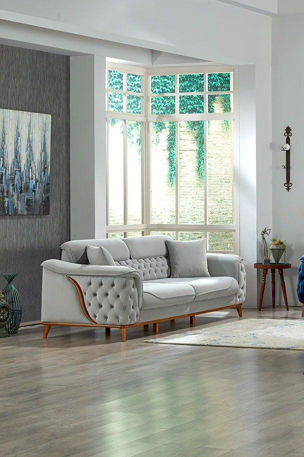 Canapeaua Larissa este extensibilă, are 3 locuri, structură sprijinită de cadrul și picioare din metal, fiind definită de elemente care asigură unicitate: detalii excepționale, butoni, cusături și forme bine conturate. Șezutul este realizat din burete și arcuri sinusoidale pentru un plus de confort.