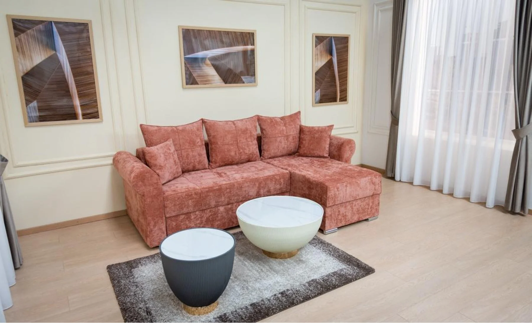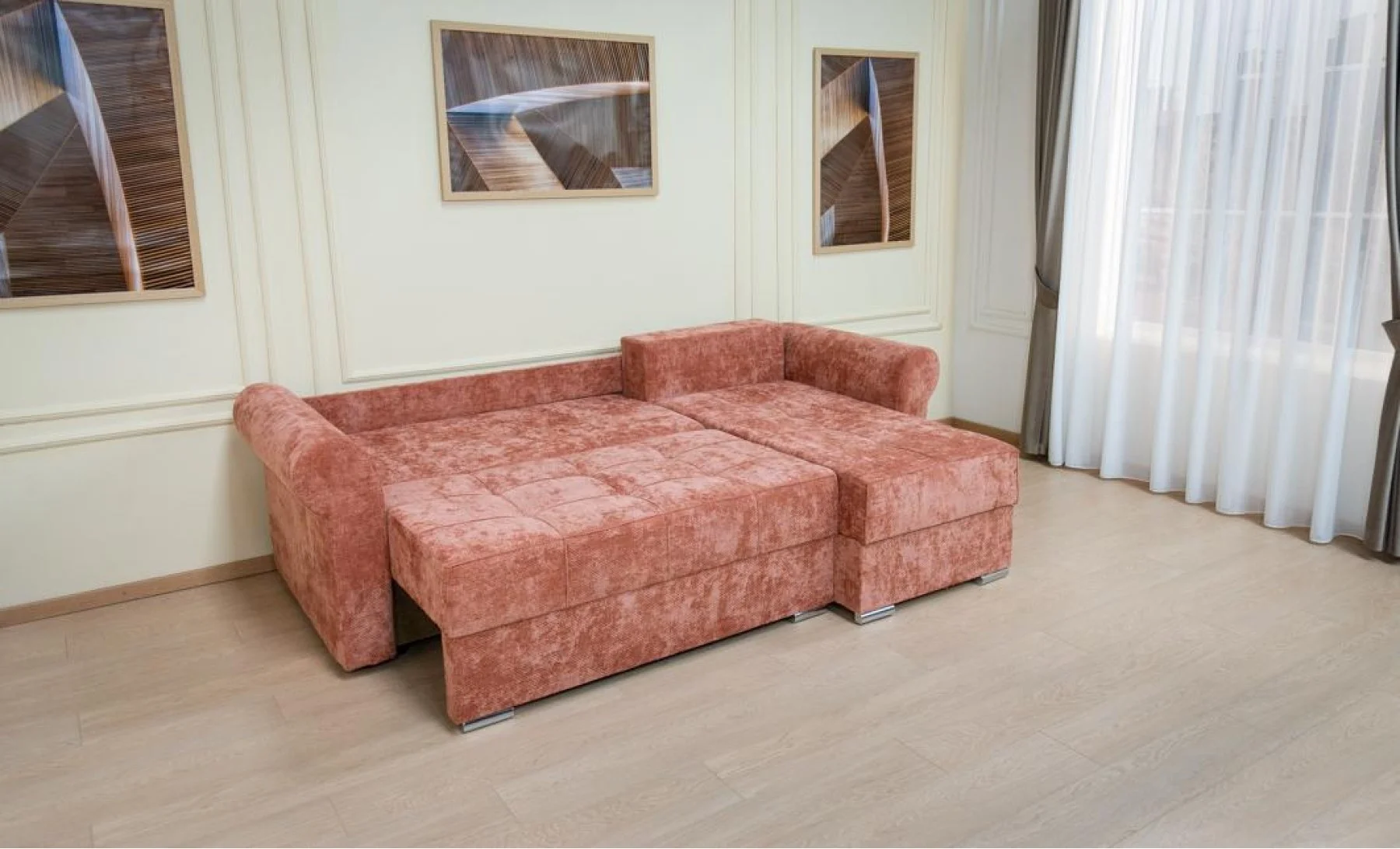 Un mare avantaj este colțul interschimbabil, care permite montarea pe stânga sau pe dreapta în funcție de spațiul din locuință. Tapiseria moale, de tip catifea, în nuanțe calde și elegante, îl transformă într-un punct central de confort și rafinament.