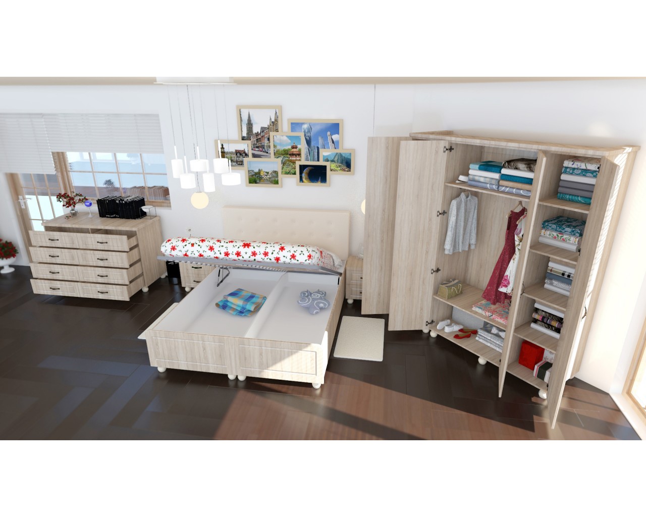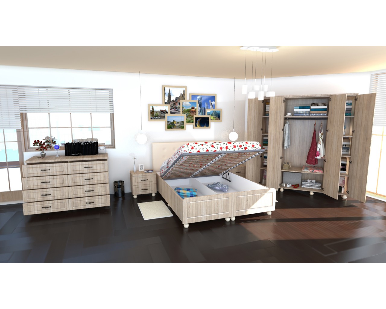 Patul cu somiera metalica rabatabila pentru saltea de 140×200 cm sau 160×200 cm sau 180×200 cm este fabricat din MDF Sonoma cu grosimea de 25 mm, iar tablia de la cap este imbracata in burete gros si tapitata cu piele ecologica bej cu nasturi pentru un aspect deosebit, dar si pentru un confort sporit la cap si spate atunci cand se sta in pozitie de citit sau de privit la televizor. Somiera metalica cu fasii din lemn se ridica pe pistoane, transformand astfel tot interiorul patului intr-o lada de depozitare generoasa. Datorita fundului patului fabricat din PAL melaminat cu grosimea de 16 mm se pot depozita fara probleme in lada obiecte grele si voluminoase. Patul este pe picioare din lemn vopsit pentru un aspect deosebit, dar si pentru aspirarea cu usurinta pe sub pat. Latimea totala a patului este de 1505 mm (varianta pentru saltea de 140×200 cm) sau 1705 mm (varianta pentru saltea de 160×200 cm) sau 1905 mm (varianta pentru saltea de 180×200 cm), lungimea totala este de 2155 mm, iar inaltimea tabliei de la cap este de 1120 mm.