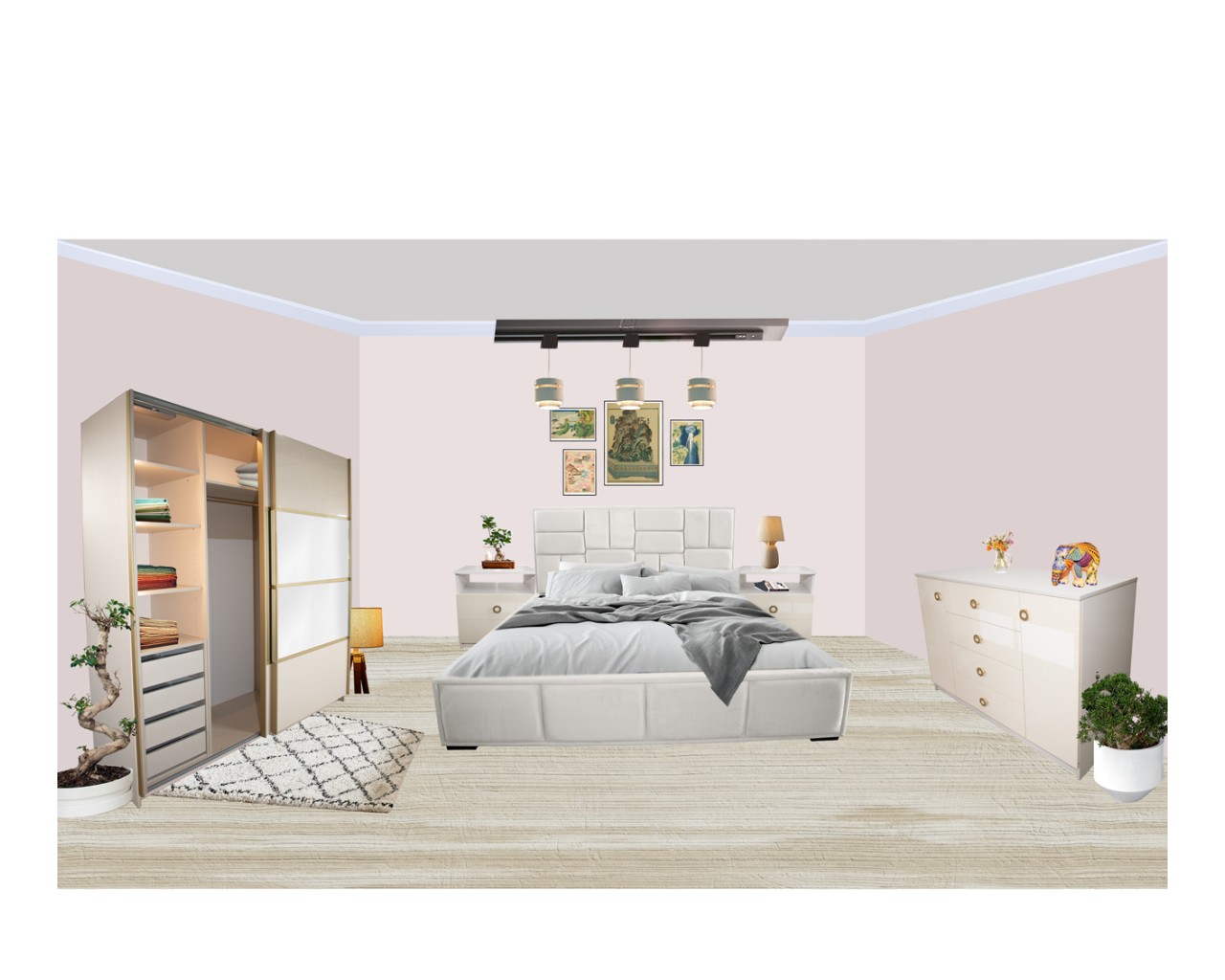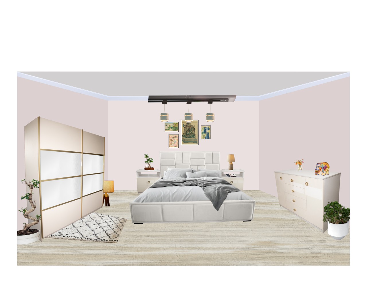 Gold Dulap 1800 Crem cu usi MDF Lucios si Oglinda + 1 Comoda
