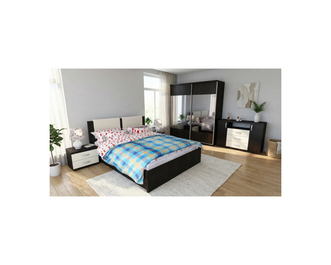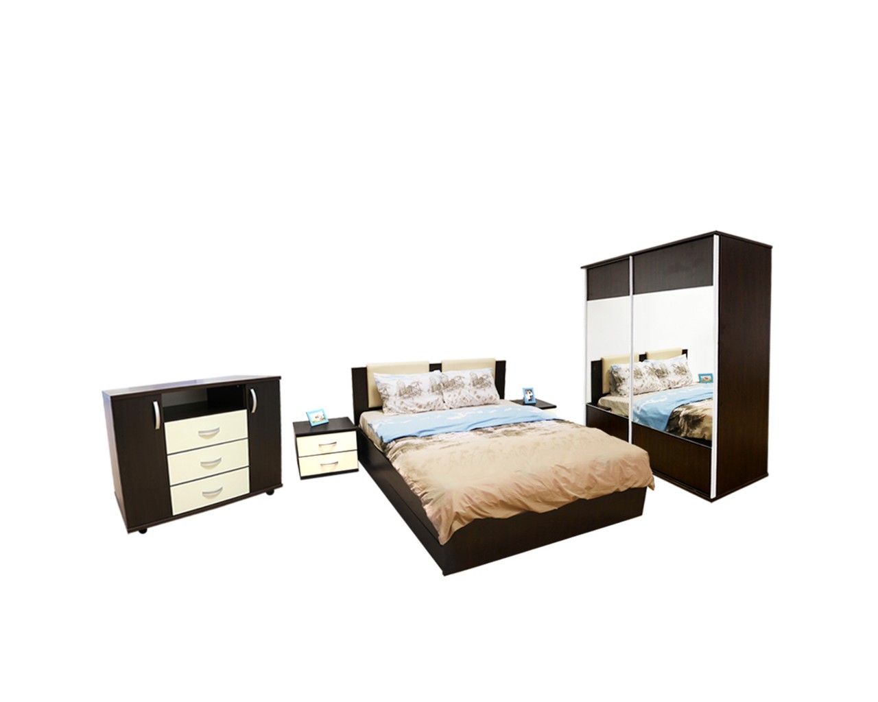 Dormitorul Laguna este o alegere moderna si practica datorita multiplelor spatii de depozitare. Dormitorul este compus din dulap cu 2 usi culisante cu oglinzi, pat cu 2 sertare sau cu somiera metalica rabatabila si lada, 2 noptiere cu cate 2 sertare si comoda cu 2 usi si 3 sertare.