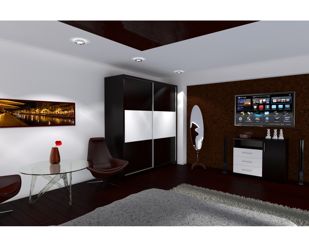 Dulapul cu 2 usi culisante este extrem de incapator datorita dimensiunilor generoase de 206 cm latime, 220 cm inaltime si 60 cm adancime. Dulapul are in interior 8 rafturi, 3 sertare foarte practice, bara pentru umerase pentru haine scurte cum ar fi camasile si sacourile, dar si o bara generoasa pentru umerase pentru haine lungi aflata in partea din mijloc, cu acces pe ambele usi. Dulapul este fabricat din PAL melaminat wenge si vanilie cu grosimea de 16 mm si cant ABS wenge. Lateralele si capacul au partea din fata din PAL melaminat wenge dublat cu grosimea de 32 mm si cant ABS wenge cu grosimea de 2 mm pentru un aspect deosebit. Usile au profile din aluminiu cu rol de manere. Dulapul are picioruse din plastic cu rol impotriva zgarierii pardoselilor.
