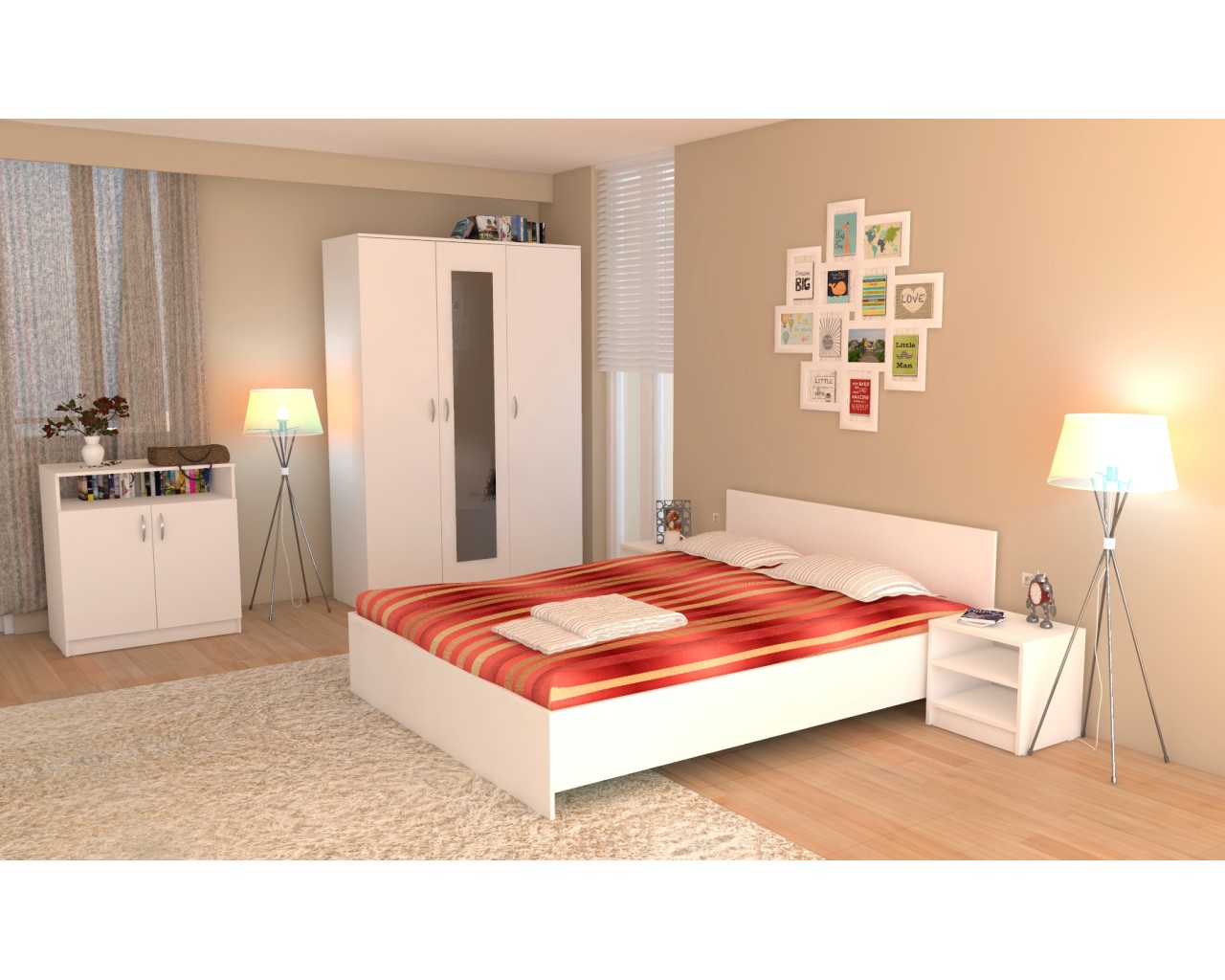 Dormitor Soft este fabricat din PAL melaminat alb cu grosimea de 16 mm. Dormitorul este compus din dulap cu 3 usi si oglinda pe usa din mijloc, pat pentru saltea de 120×200 cm sau 140×200 cm sau 160×200 cm, 2 noptiere si 1 comoda cu 2 usi.
