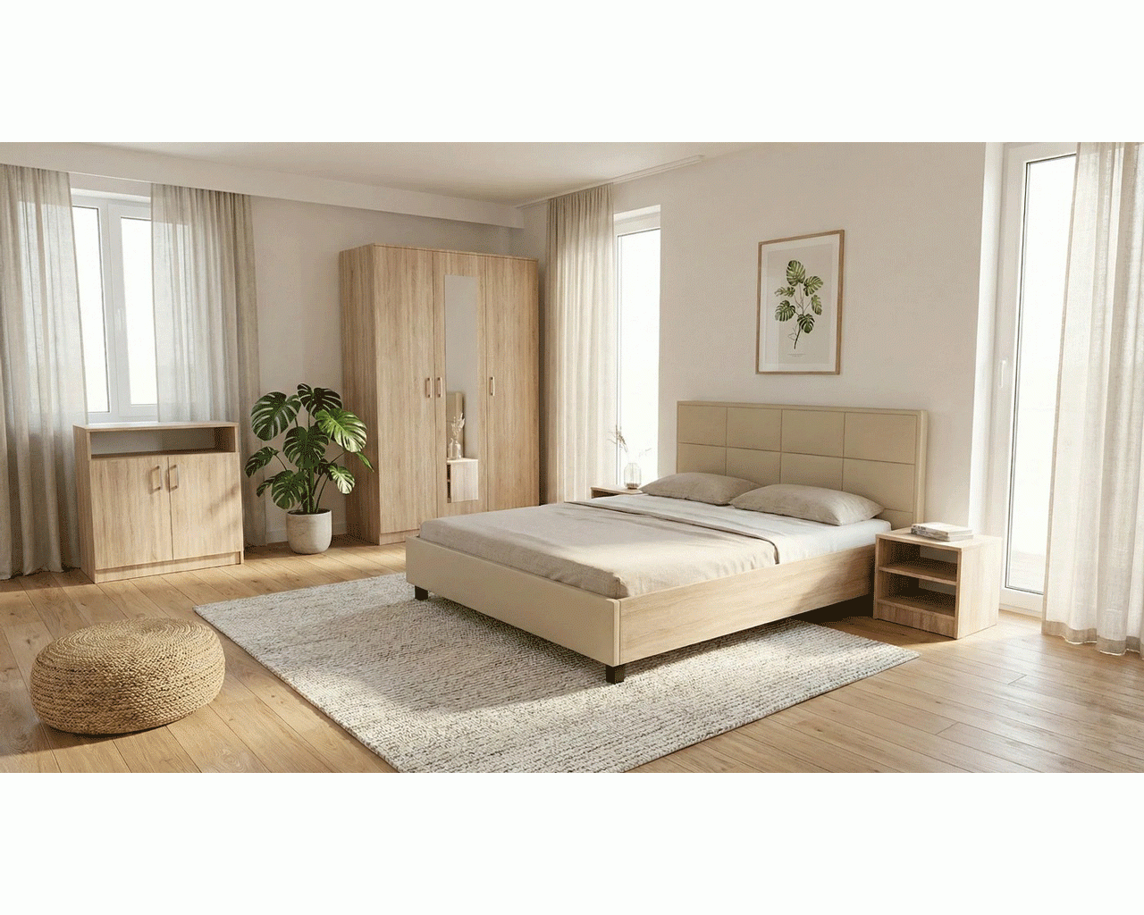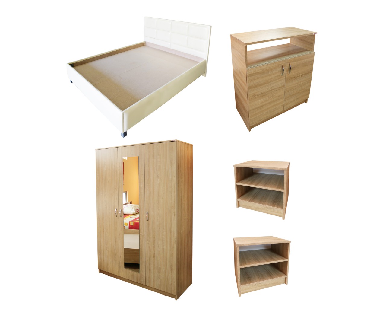 Dormitor Soft este fabricat din PAL melaminat sonoma cu grosimea de 16 mm. Dormitorul este compus din dulap cu 3 usi si oglinda pe usa din mijloc, pat pentru saltea de 140×200 cm sau 160×200 cm, 2 noptiere si 1 comoda cu 2 usi.