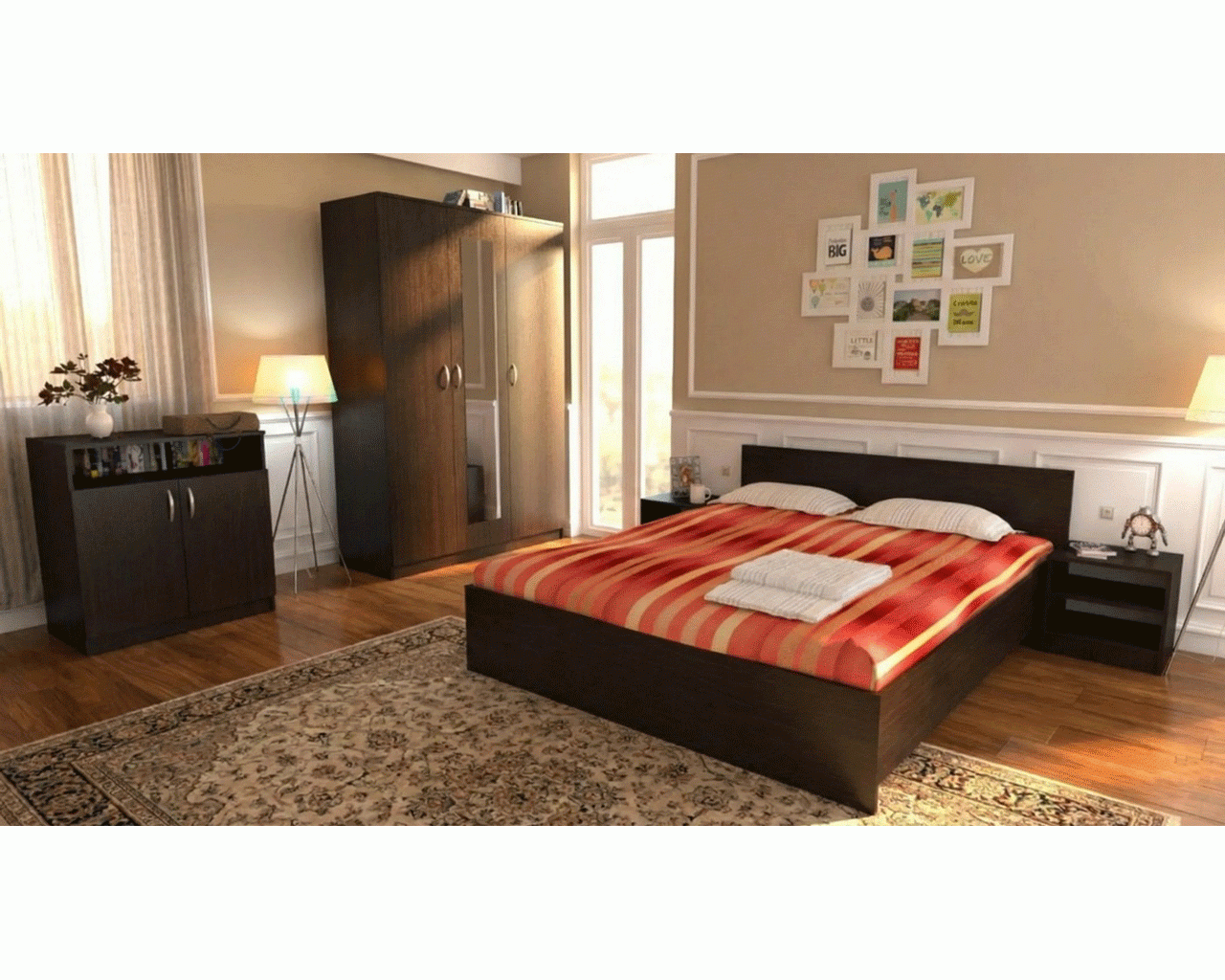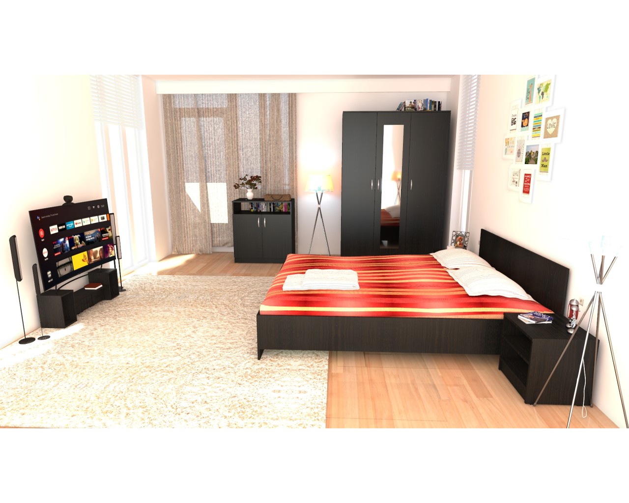 Dormitor Soft este fabricat din PAL melaminat wenge cu grosimea de 16 mm. Dormitorul este compus din dulap cu 3 usi si oglinda pe usa din mijloc, pat pentru saltea de 120×200 cm sau 140×200 cm sau 160×200 cm, 2 noptiere si 1 comoda cu 2 usi.