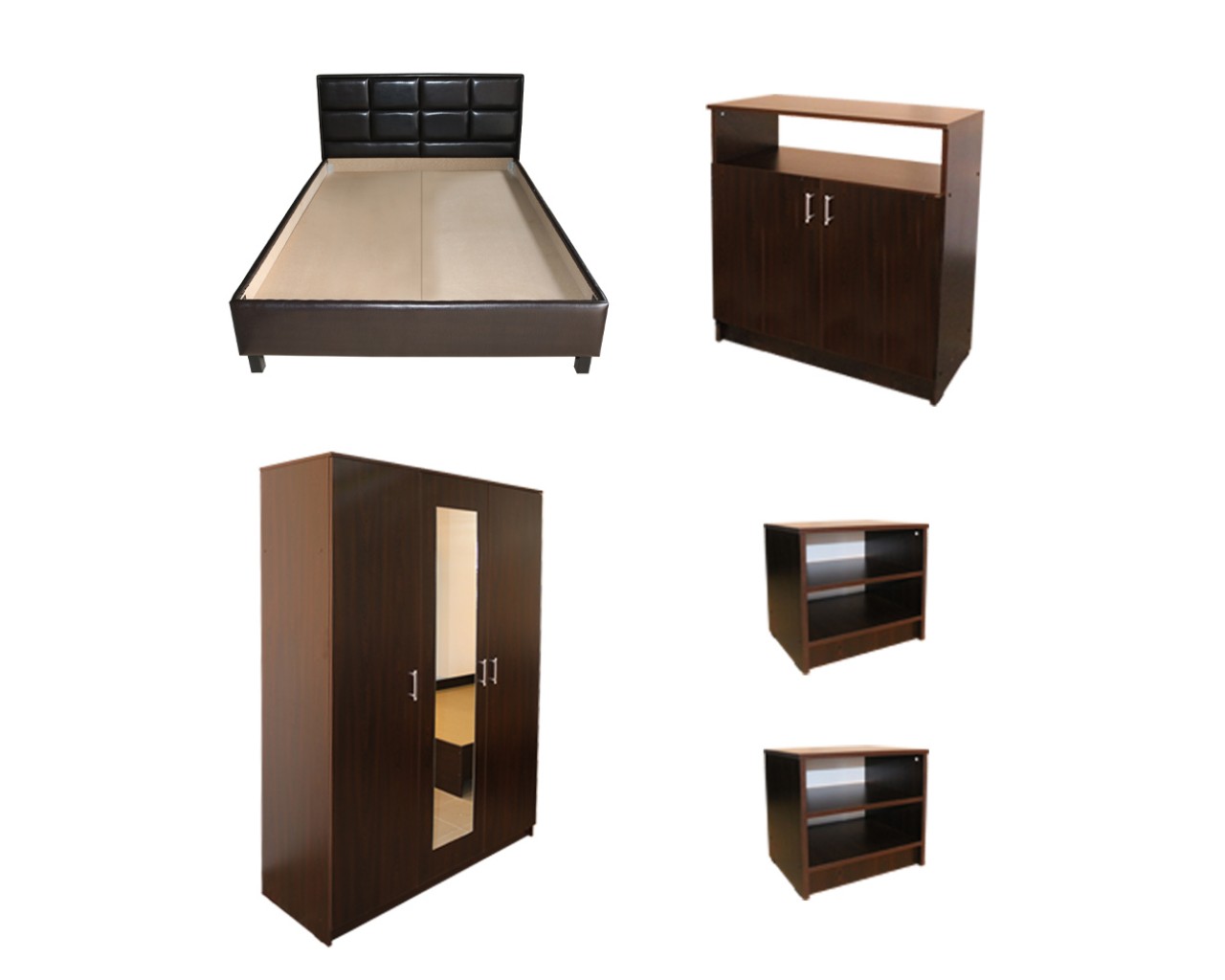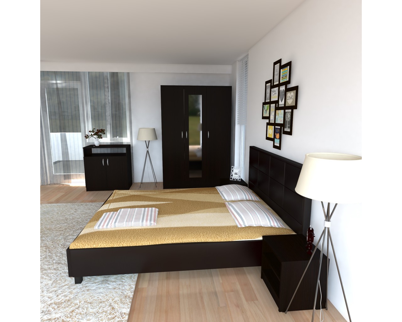 Dormitor Soft este fabricat din PAL melaminat wenge cu grosimea de 16 mm. Dormitorul este compus din dulap cu 3 usi si oglinda pe usa din mijloc, pat pentru saltea de 140×200 cm sau 160×200 cm, 2 noptiere si 1 comoda cu 2 usi.