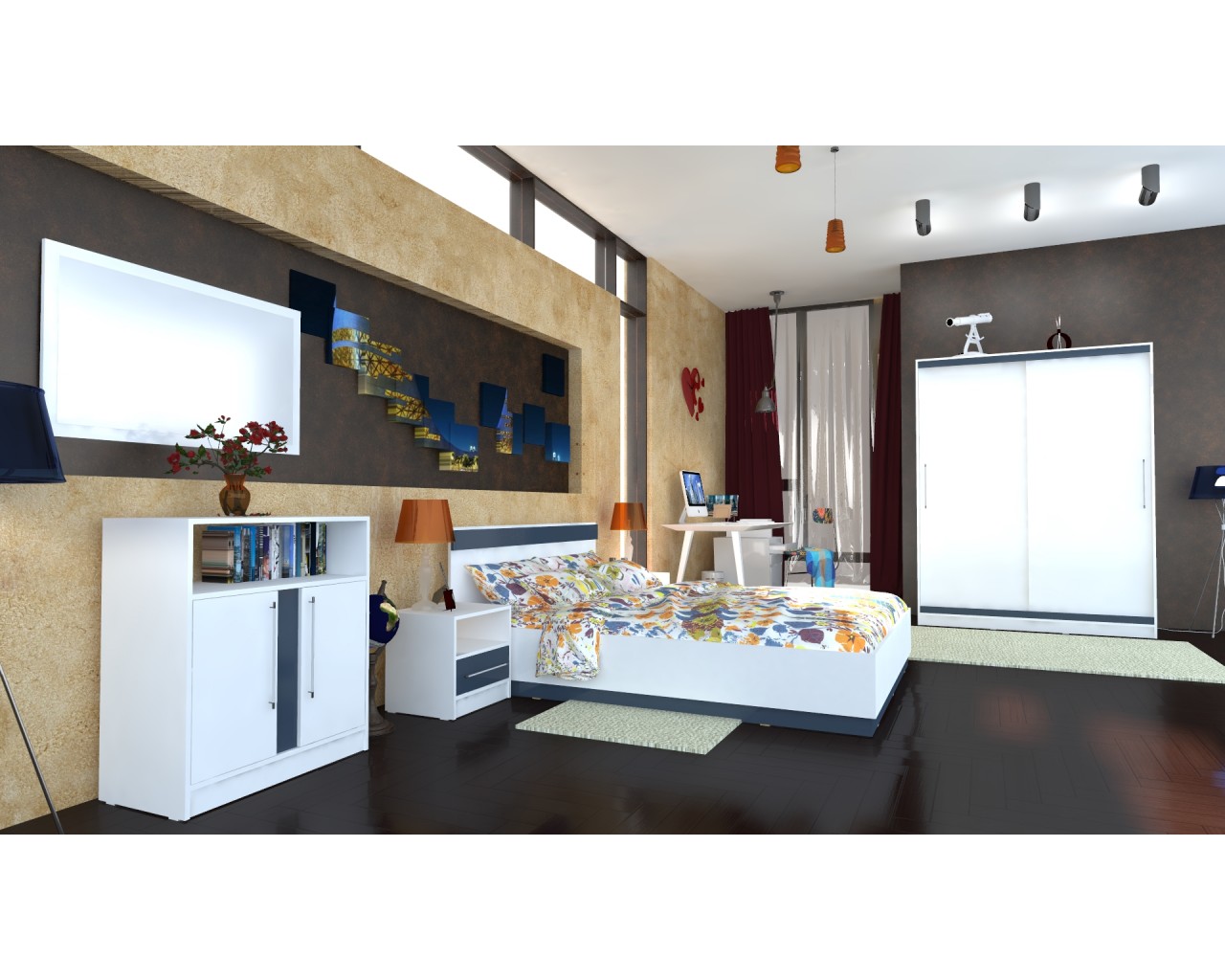 Dormitorul Verona reprezinta o alegere practica datorita dimensiunilor potrivite pentru orice dormitor, dar si pentru multiplele spatii de depozitare. Dormitorul este compus din dulap cu 2 usi culisante, pat pentru saltea 140×200 cm sau 160×200 cm, 2 noptiere cu cate 1 sertar si comoda cu 2 usi. Dormitorul Verona este fabricat din PAL melaminat Alb si gri cu grosimea de 16 mm si cant ABS Alb cu grosimea de 0.4 mm. Manerele sunt metalice pentru o rezistenta sporita la uzura, dar si pentru un aspect modern. Toate piesele dormitorului au picioruse din plastic cu rol impotriva zgarierii pardoselilor.