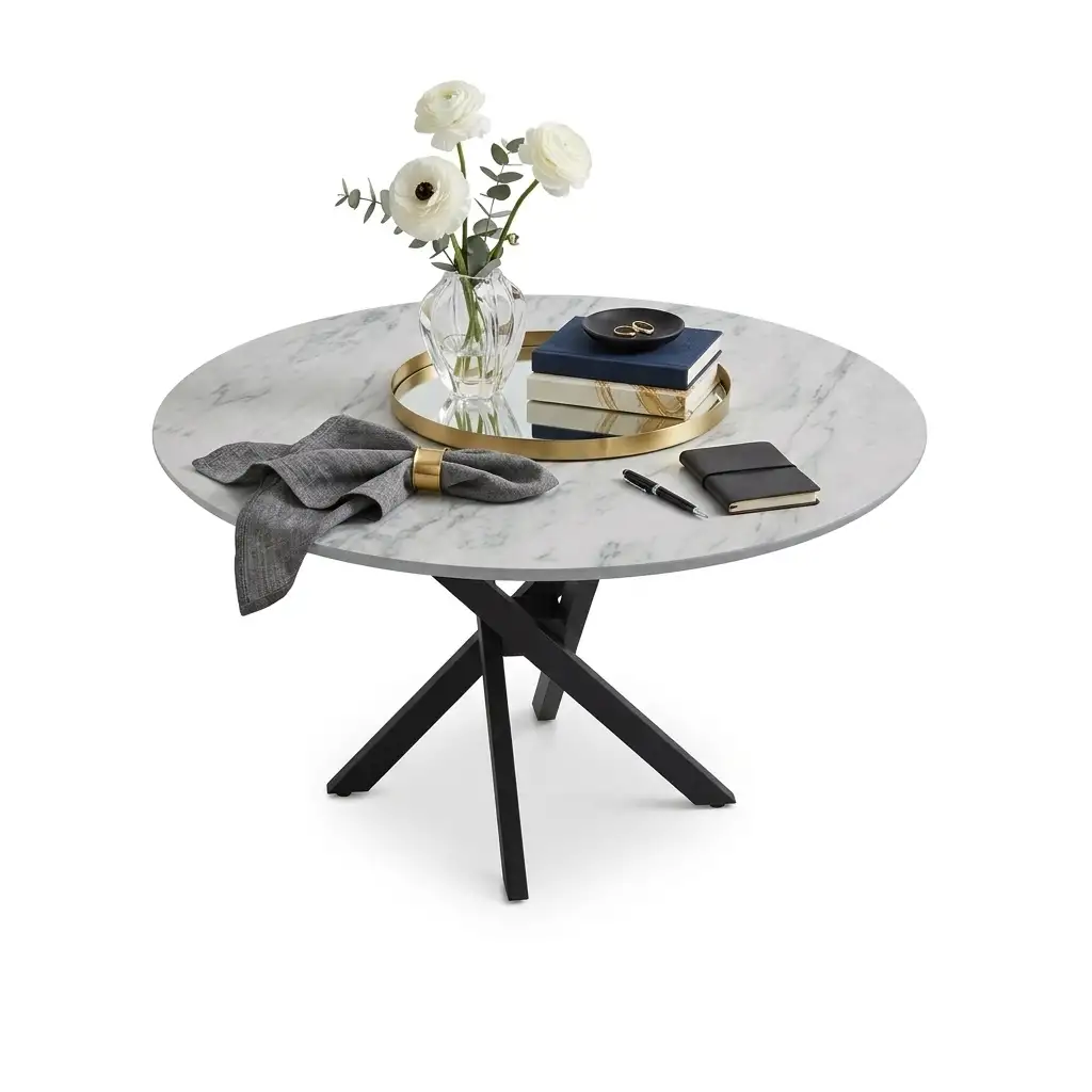 Blatul mesei este realizat din Mdf care imită marmura albă, prezentând nervuri discrete de culoare gri. Această finisare oferă un aspect luxos și este ușor de întreținut.