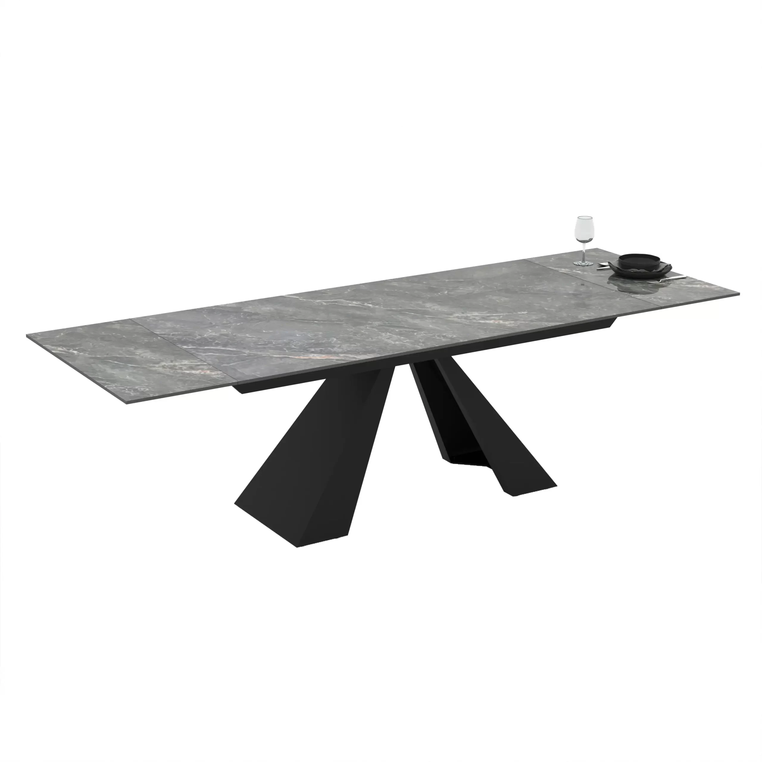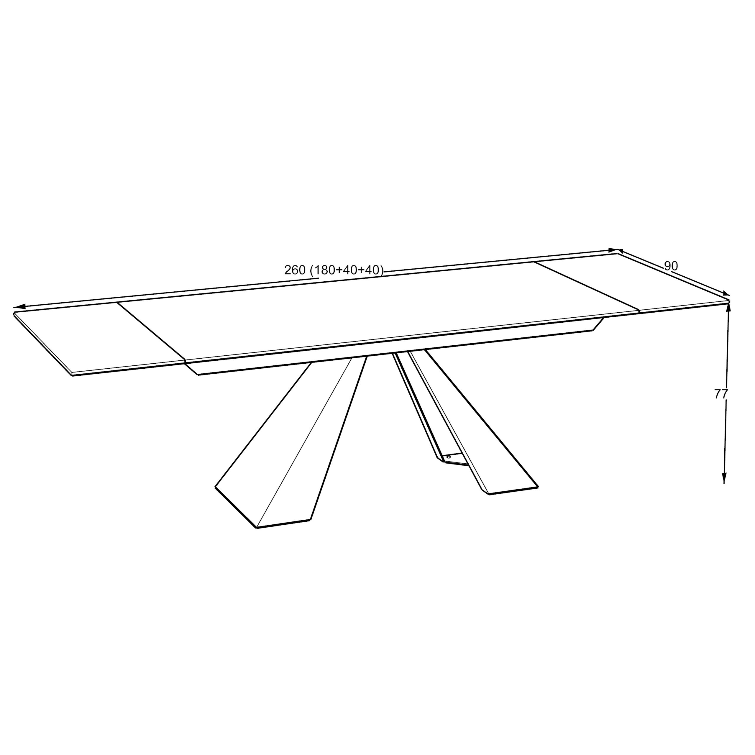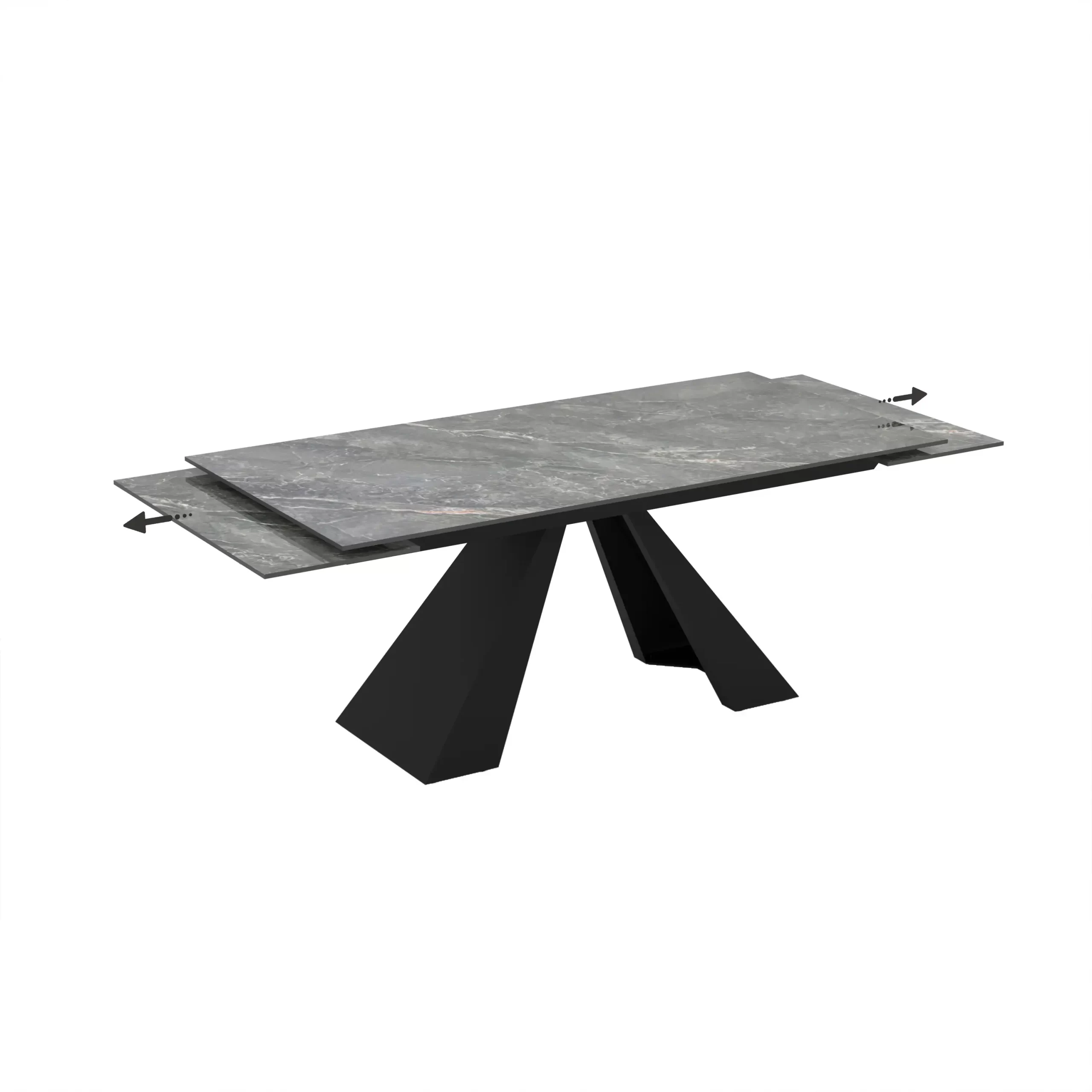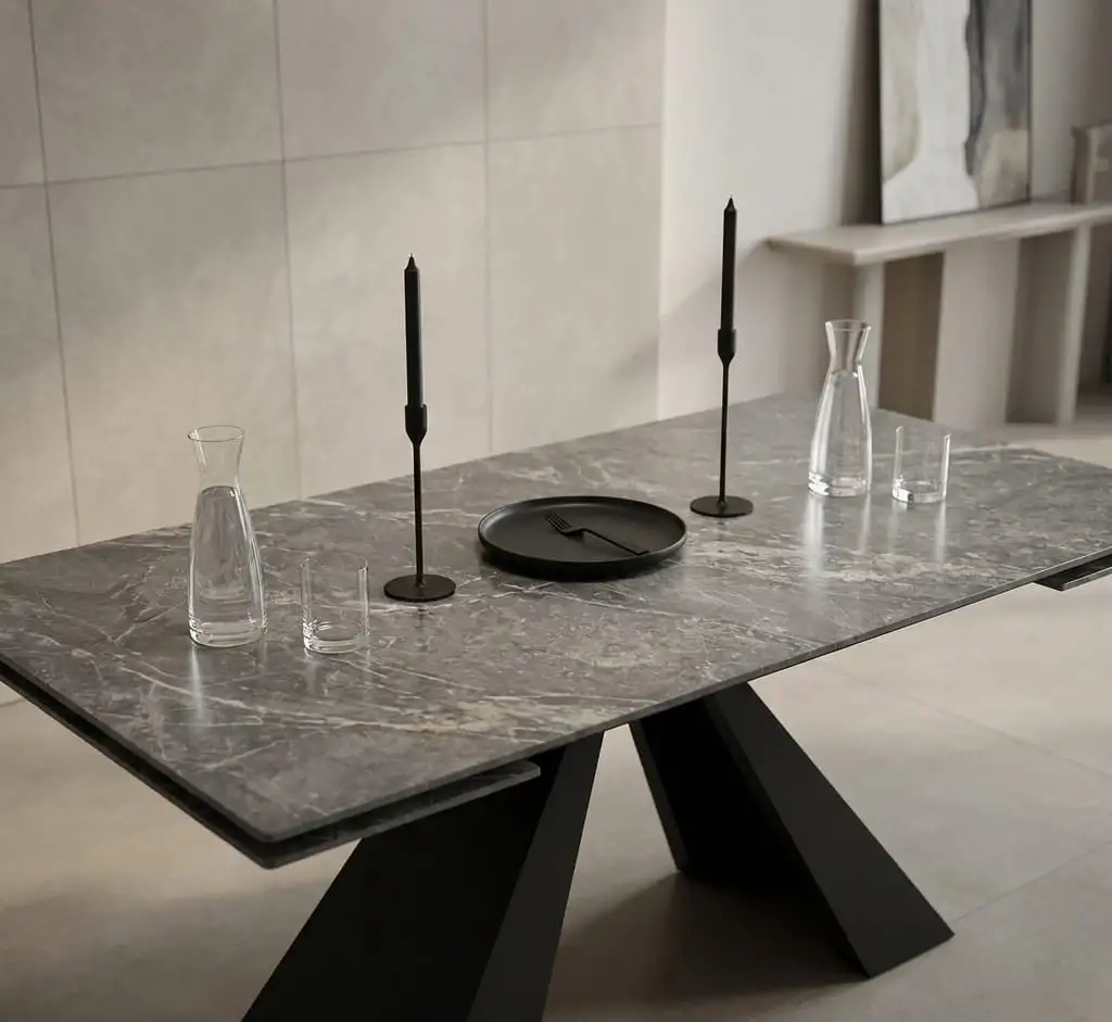 Masa extensibila Zina este o piesă de mobilier definită prin contrastul puternic dintre blatul din ceramica luminos și baza structurală închisă.Aspectul de marmoră travertin cu nervuri subtile în nuanțe de crem, oferind o notă de lux și eleganță.Blatul are margini drepte, curate și un profil subțire, ceea ce îi conferă o alură aerisită, în ciuda dimensiunilor sale generoase.