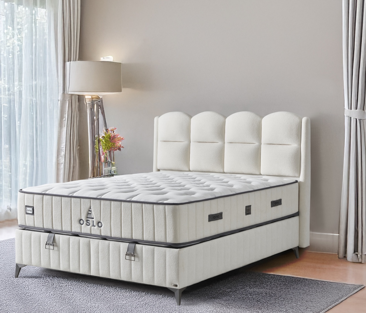 Patul tapitat Oslo are un design simplu, dar elegant si este usor de asortat cu orice mobilier de dormitor.