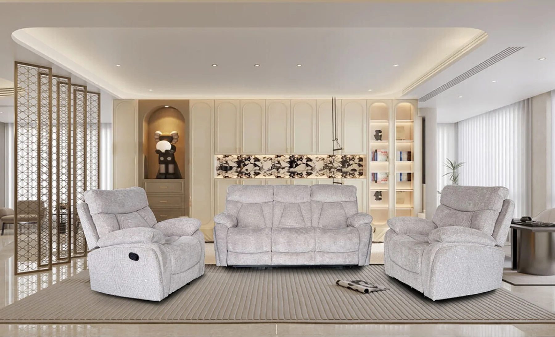 Creează un spațiu de relaxare rafinat și confortabil cu Setul Recliner manual, culoare bej, compus dintr-o canapea spațioasă și două fotolii individuale, toate dotate cu mecanism de înclinare pentru o experiență completă de odihnă.